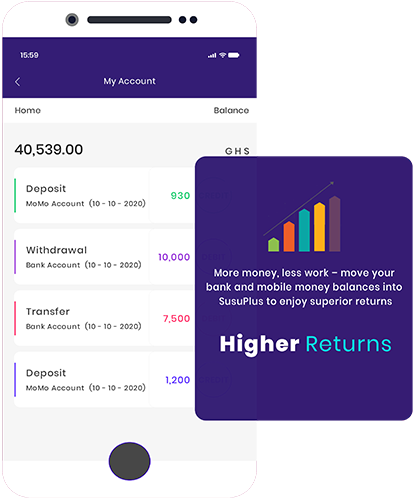A personal cash account that offers instant liquidity, safety and returns higher than bank account/momo rates. With SusuPlus you can: